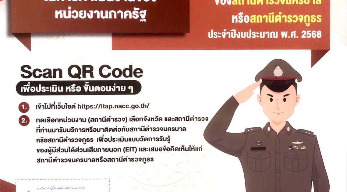 ขอเชิญชวนประชาชนที่มาใช้บริการ สภ.ฉิมพลี ร่วมประเมินคุณธรรมและความโปร่งใสในการดำเนินงานของหน่วยงานภาครัฐ ประจำปีงบประมาณ 2568