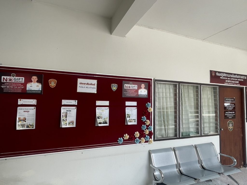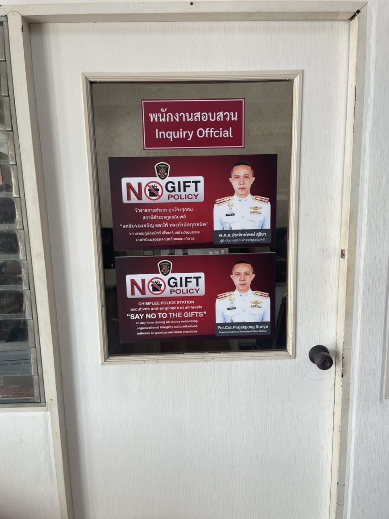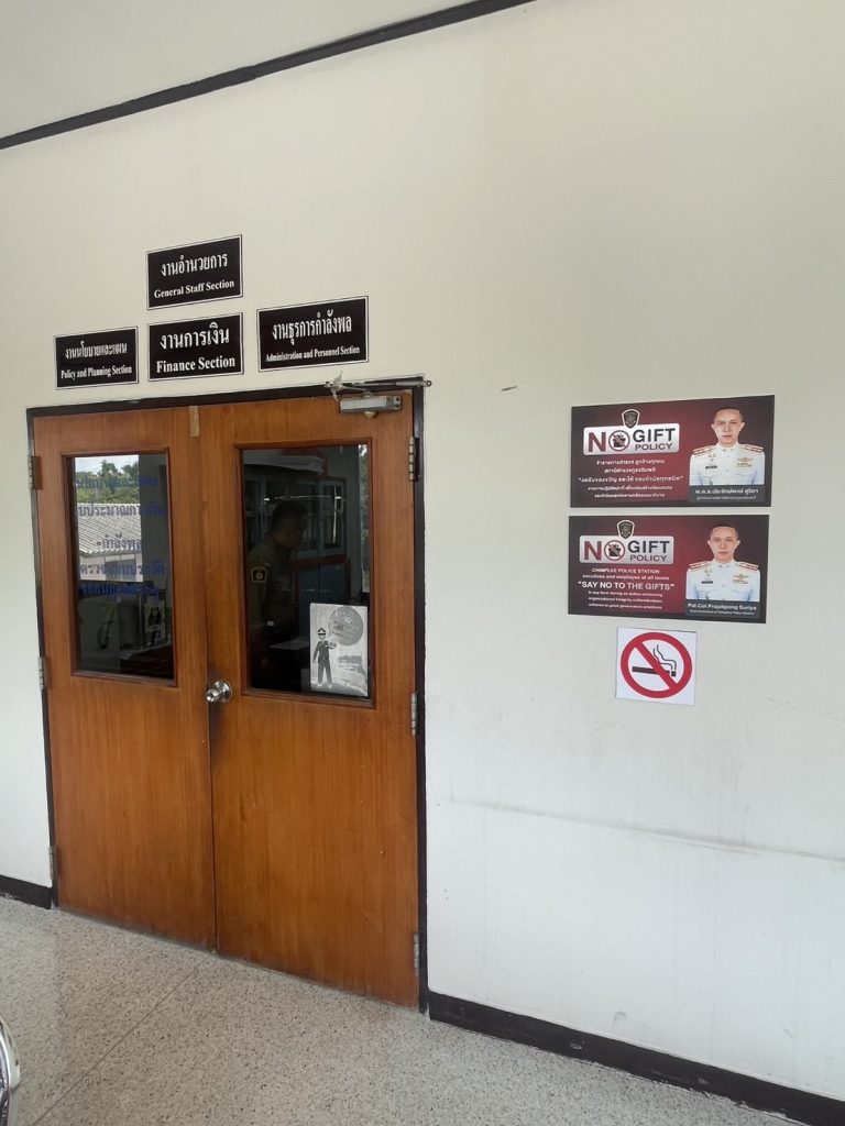 ภาพแสดงป้ายประชาสัมพันธ์เผยแพร่นโยบายาศสถานีตํารวจภูธรฉิมพลี เรื่อง นโยบายต่อต้านการรับสินบน (Anti-Bribery Policy) และการไม่รับของขวัญของกํานัลหรือประโยชน์อื่นใด (No Gift Policy) จากการปฏิบัติหน้าที่ประจําปีงบประมาณ พ.ศ.2568 ภายในหน่วยงาน